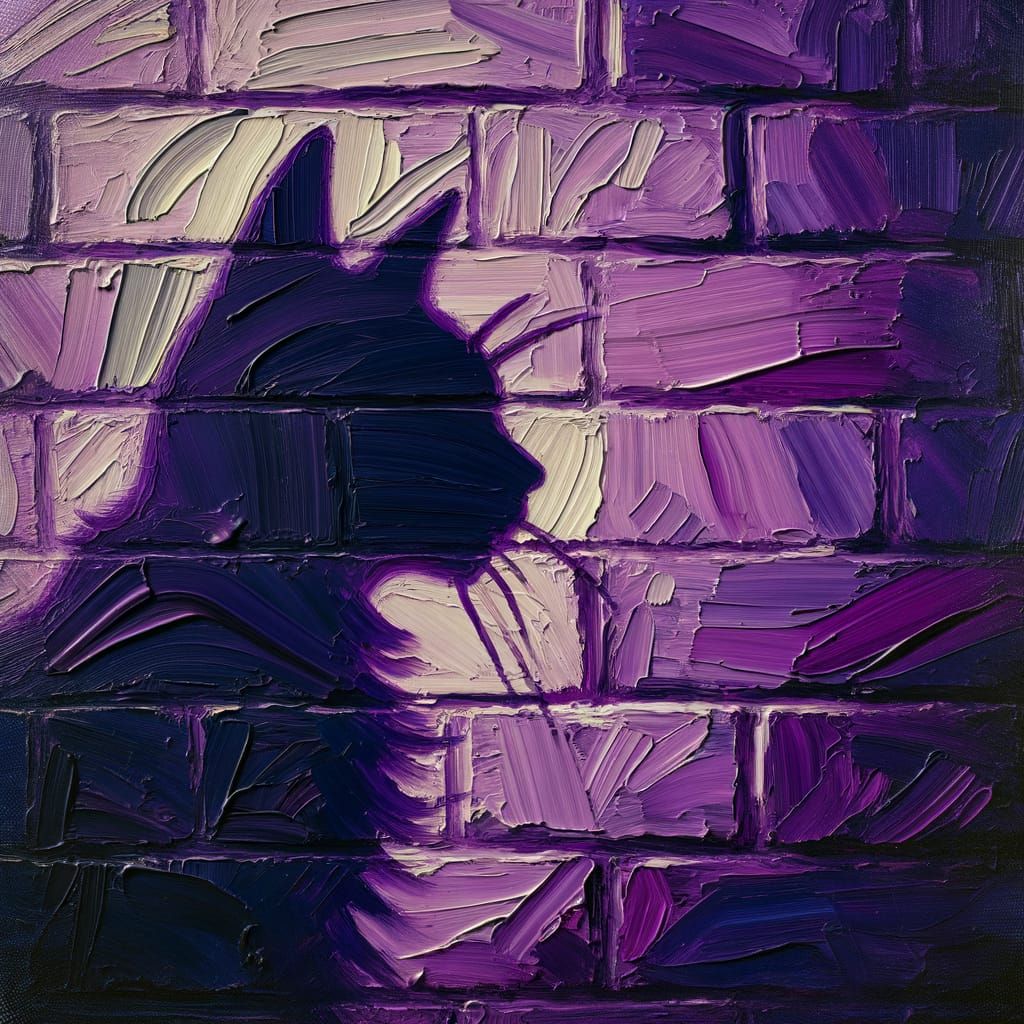 This image shows the shadow of a cat cast upon a vibrant purple brick wall. Rendered in an expressionist impasto style with thick paint application and bold shapes.