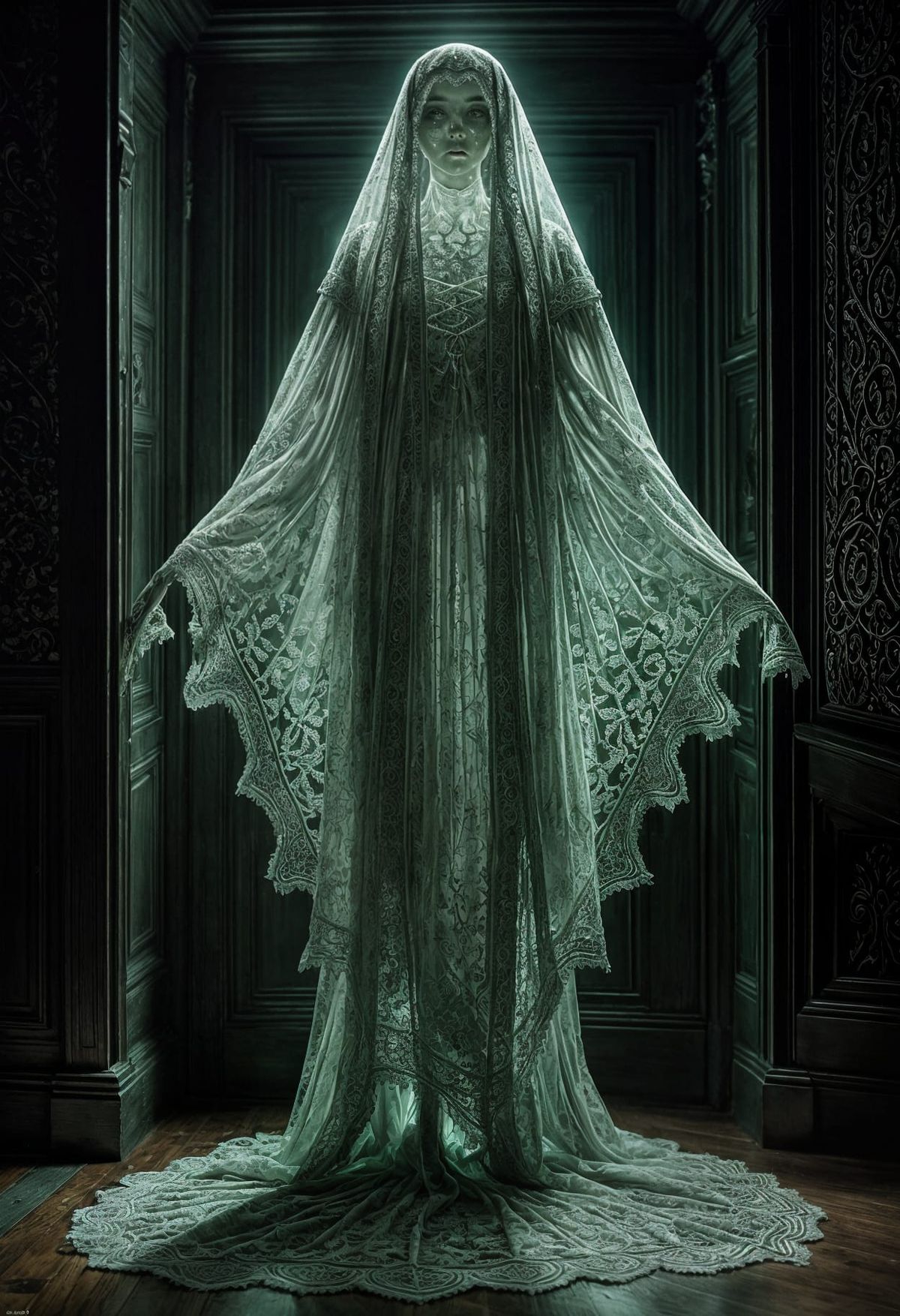 A photorealistic CGI image of a bioluminescent ghost made of intricate green torchon lace filigree, haunting a creepy old house. The image features ultra-detailed and beautiful cinematography.