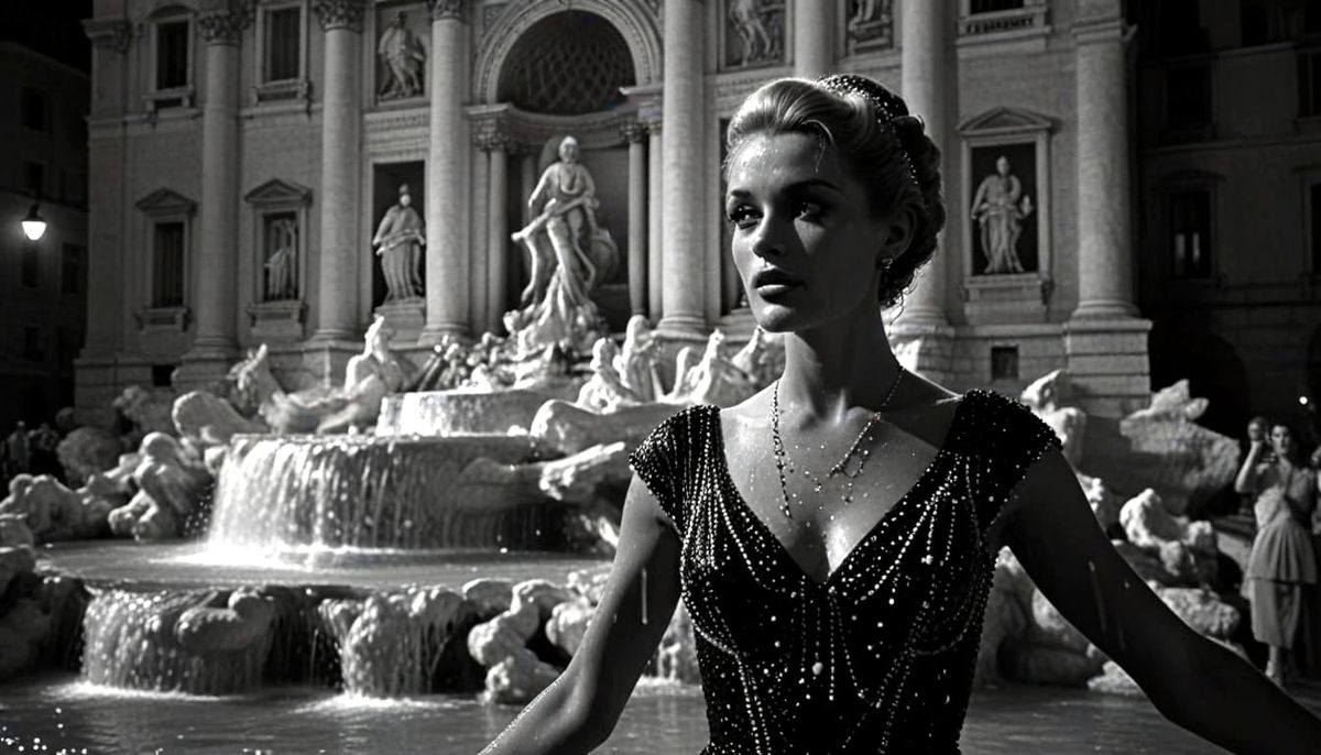 A captivating black and white image of the Trevi Fountain in Rome. A woman in a 1960s dress enters the water under moonlight, with a vintage Italian style and dramatic lighting.