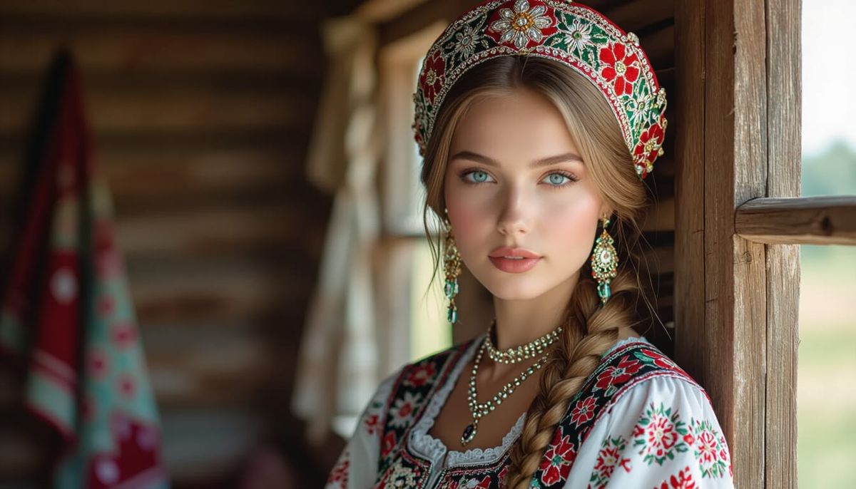 "A photorealistic portrait of a beautiful 32-year-old Russian woman with fair skin and blue eyes, wearing an elegant kokoshnik headdress and a sarafan dress, standing in a wooden izba with traditional embroidery, soft natural lighting, professional photography style."