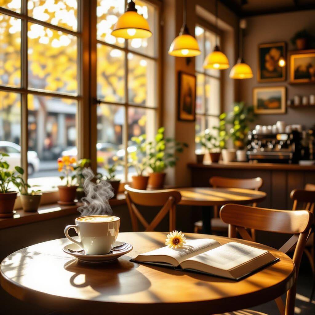 This image shows a cozy coffee shop bathed in golden sunlight, featuring a steaming latte, an open book, and warm pendant lights. Digital matte painting with atmospheric lighting and intricate textures.