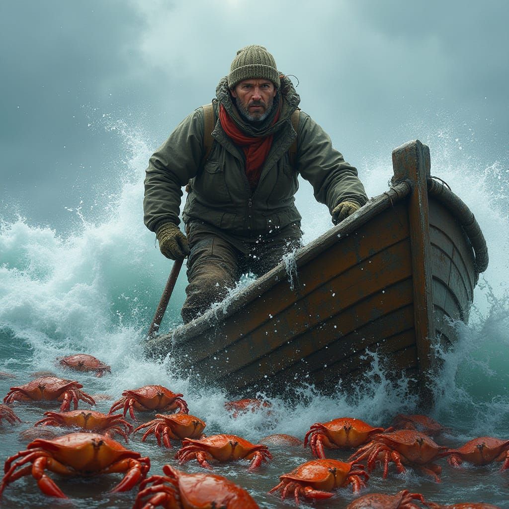 This image shows a determined fisherman bracing against the fury of a stormy sea, surrounded by a bounty of red crabs. The scene is rendered in a dynamic, expressive style with vivid, high-contrast colors and intricate textures, reminiscent of modern digital art and the works of Ivan Aivazovsky.