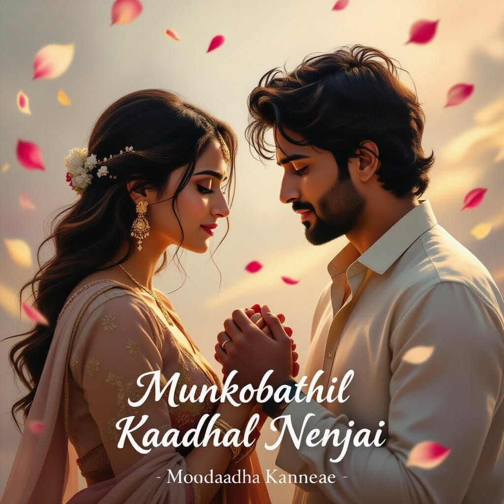 This cinematic painting captures a South Asian couple experiencing tension and longing. The woman's glistening eyes and the man's pleading gesture convey unspoken emotions amidst a dreamlike, swirling backdrop.