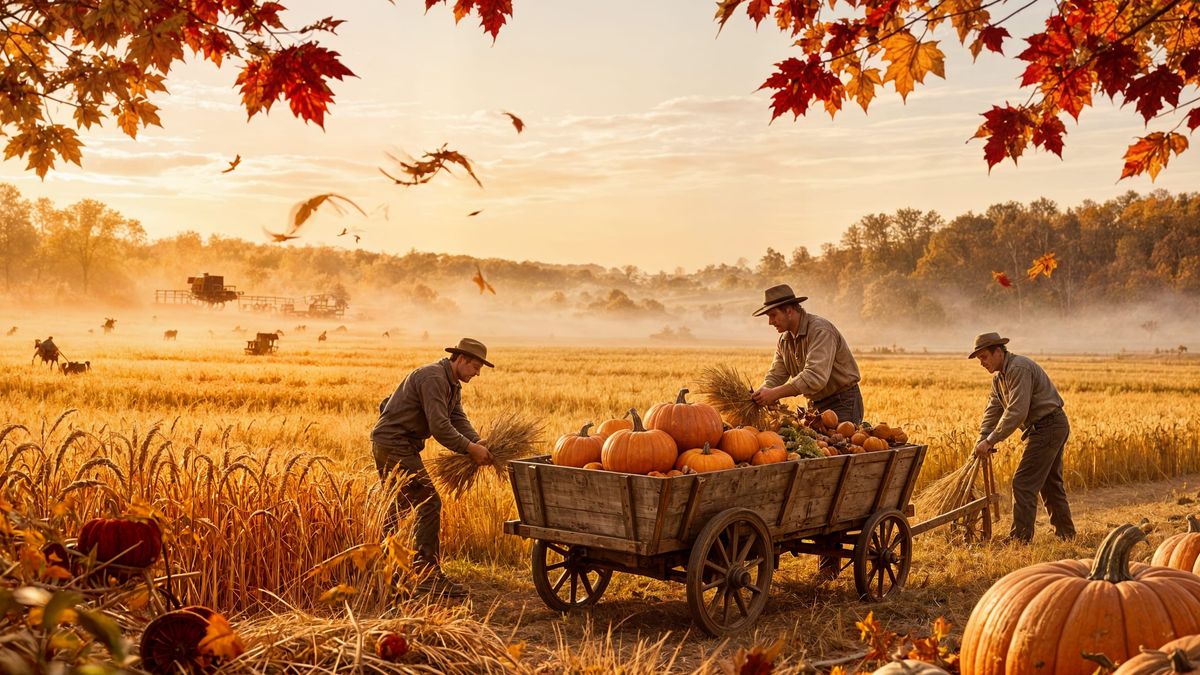This image shows a hyper-realistic autumn harvest at golden hour. Farmers gather wheat and pumpkins in glowing amber light, with swirling leaves and atmospheric fog.