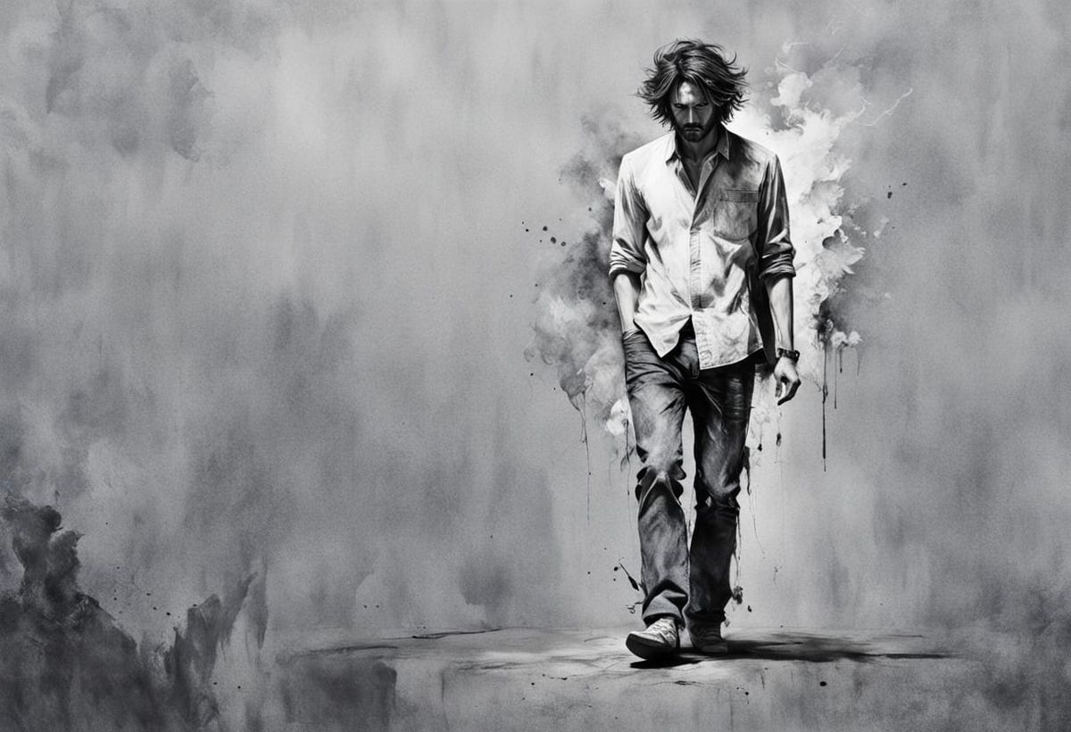 A striking image of a man in monochromatic tones, captured in a medium shot with dramatic chiaroscuro lighting. His intense gaze and relaxed yet sensual style draw the viewer in.