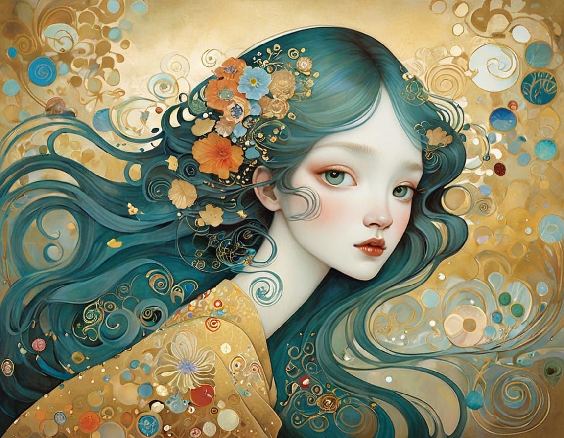 This AI-generated artwork blends the decorative elegance of Gustav Klimt with the detailed realism of Lucy Grossmith, creating a unique visual tapestry.