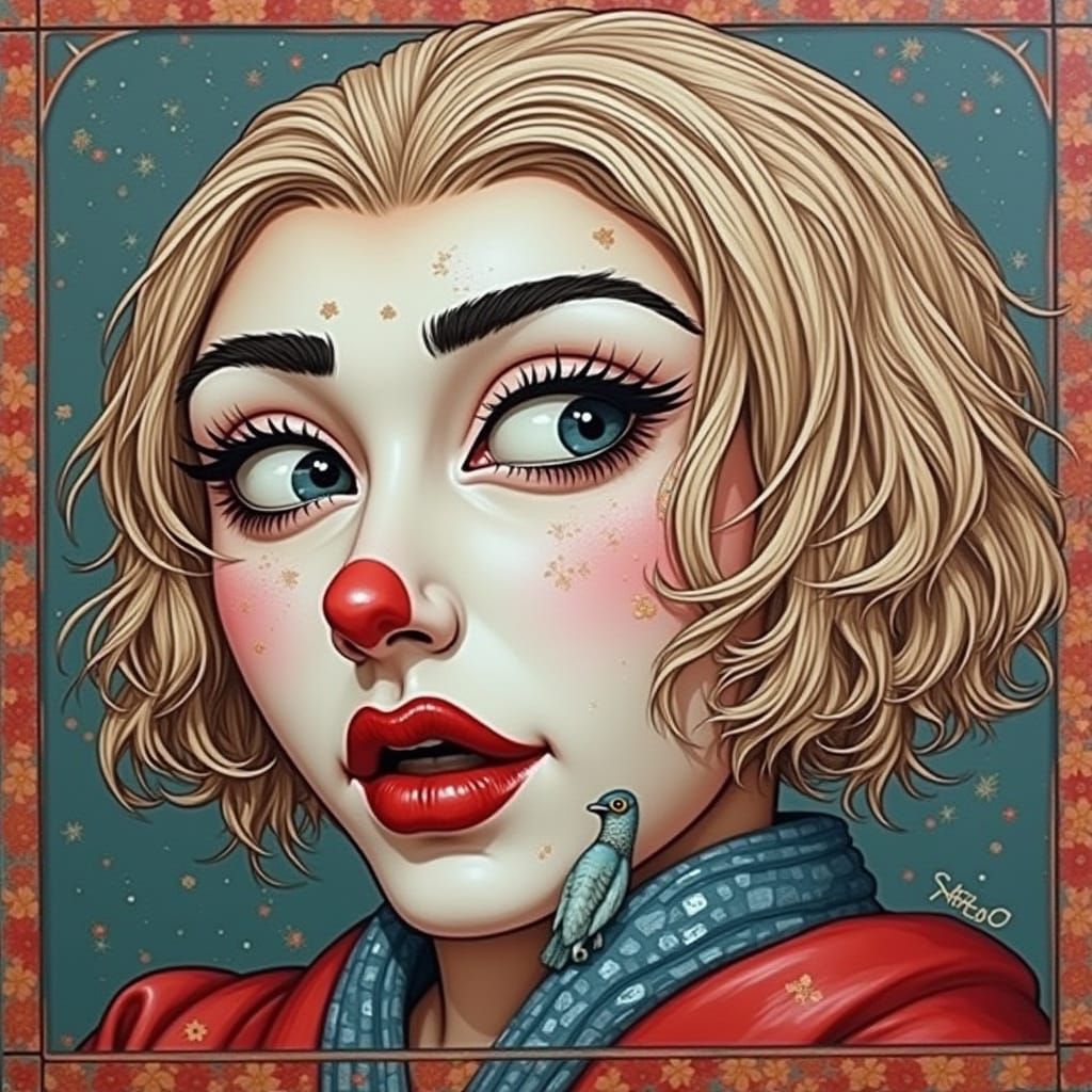 This image shows a fusion of Tutankhamun, Harlequin, and Geisha elements, dominated by shades of red. The artwork is photorealistic with sharp details and natural colors.
