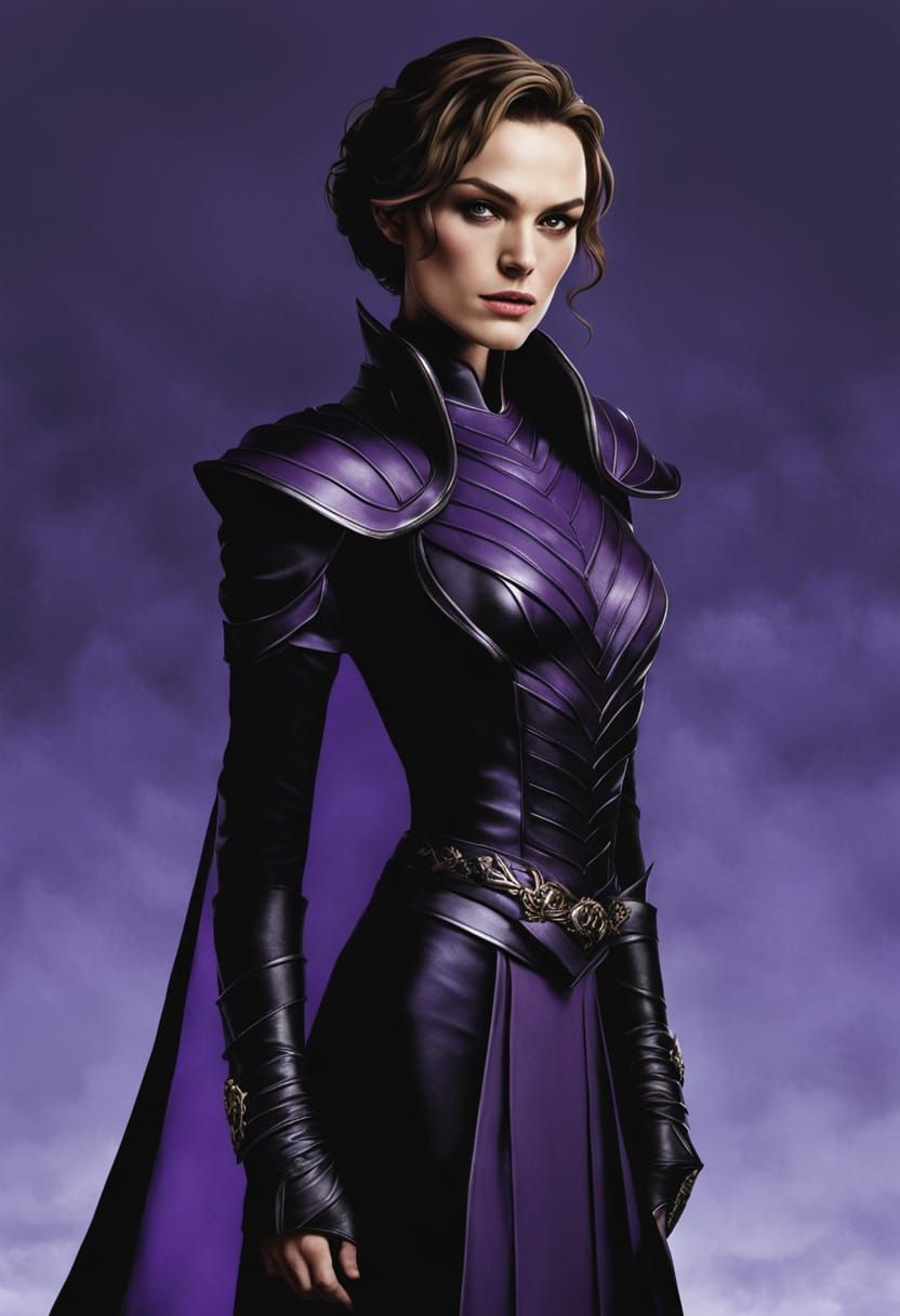 This image shows a detailed and realistic full-body portrait of a beautiful, sadistic woman with a sinister smile in black and purple armor, set against a Snake Mountain backdrop.