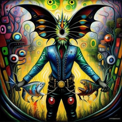 A vibrant, detailed oil painting of an angler fish. The artwork features mosaic elements and a pop surrealism aesthetic with metaphysical undertones, reminiscent of chrome art.