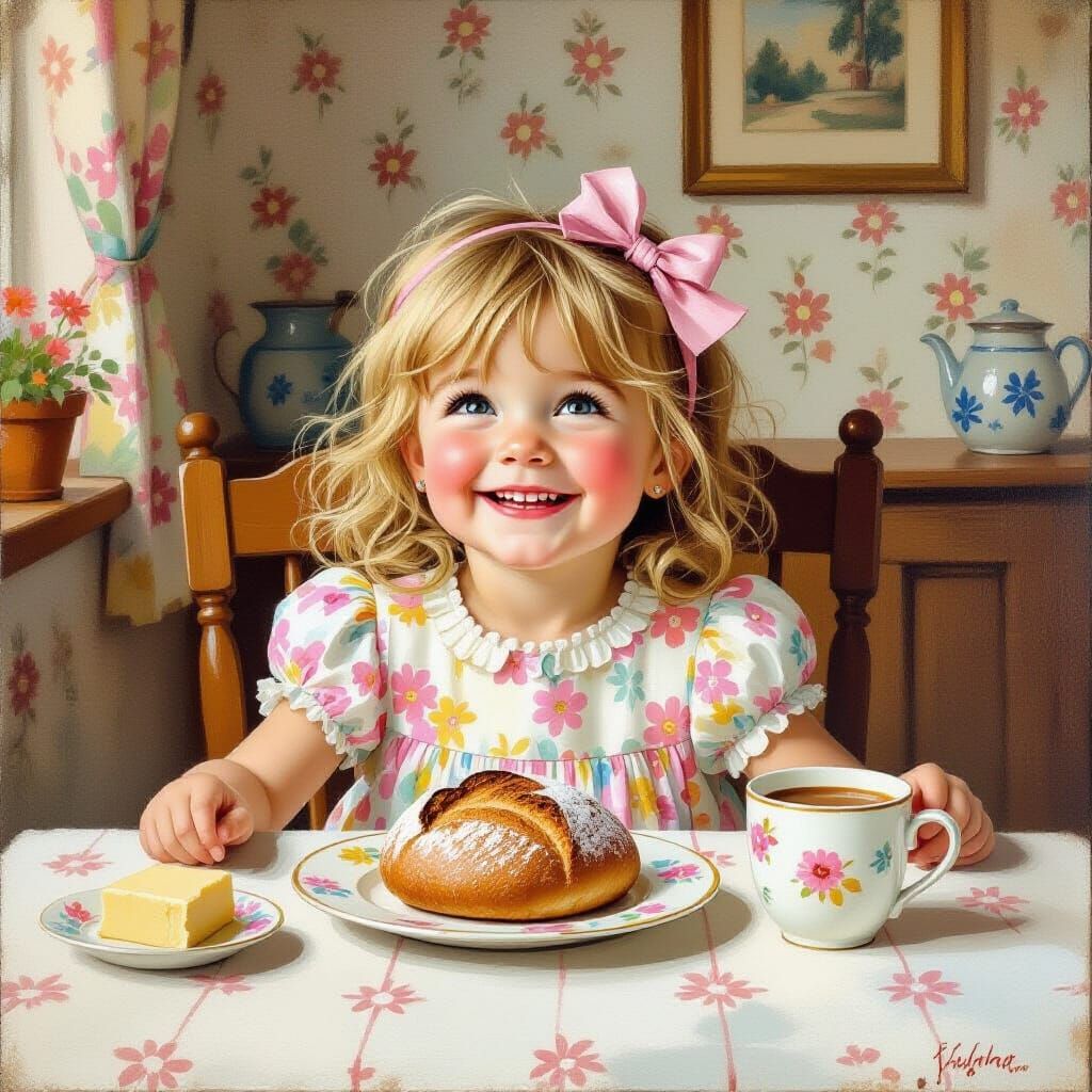 This image shows a four-year-old girl laughing joyfully at a table with bread, cheese and cocoa. The image is drawn with soft pastel colors in a Beatrix Potter-like style.