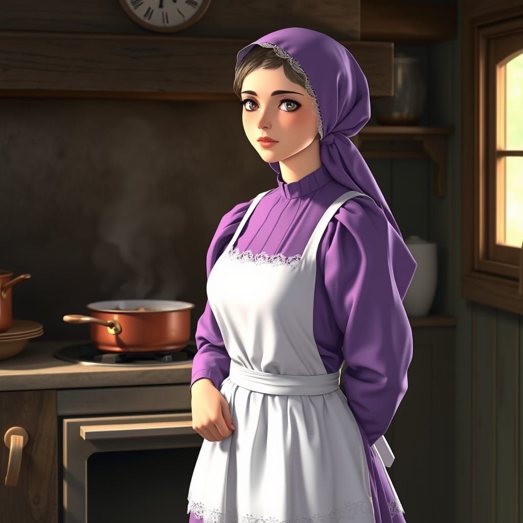 This image depicts a peaceful Amish woman standing in front of a rustic wood stove, wearing a beautiful purple dress and crisp white apron, surrounded by warm and inviting details reminiscent of concept art and anime masterpieces.