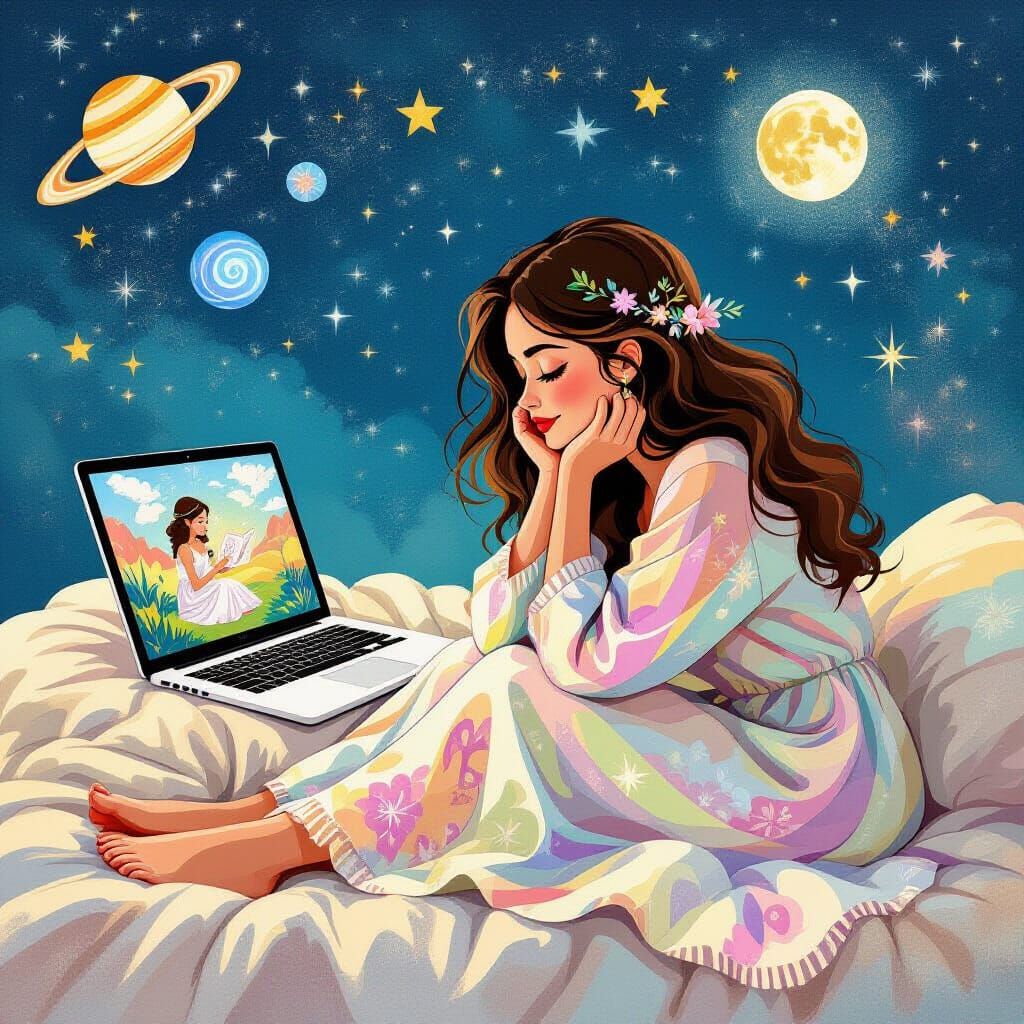 This image shows a cartoon illustration of a woman in a dress and slippers, resting on a bed with a laptop. It features holographic and cosmic elements, inspired by vibrant, intricate art styles.