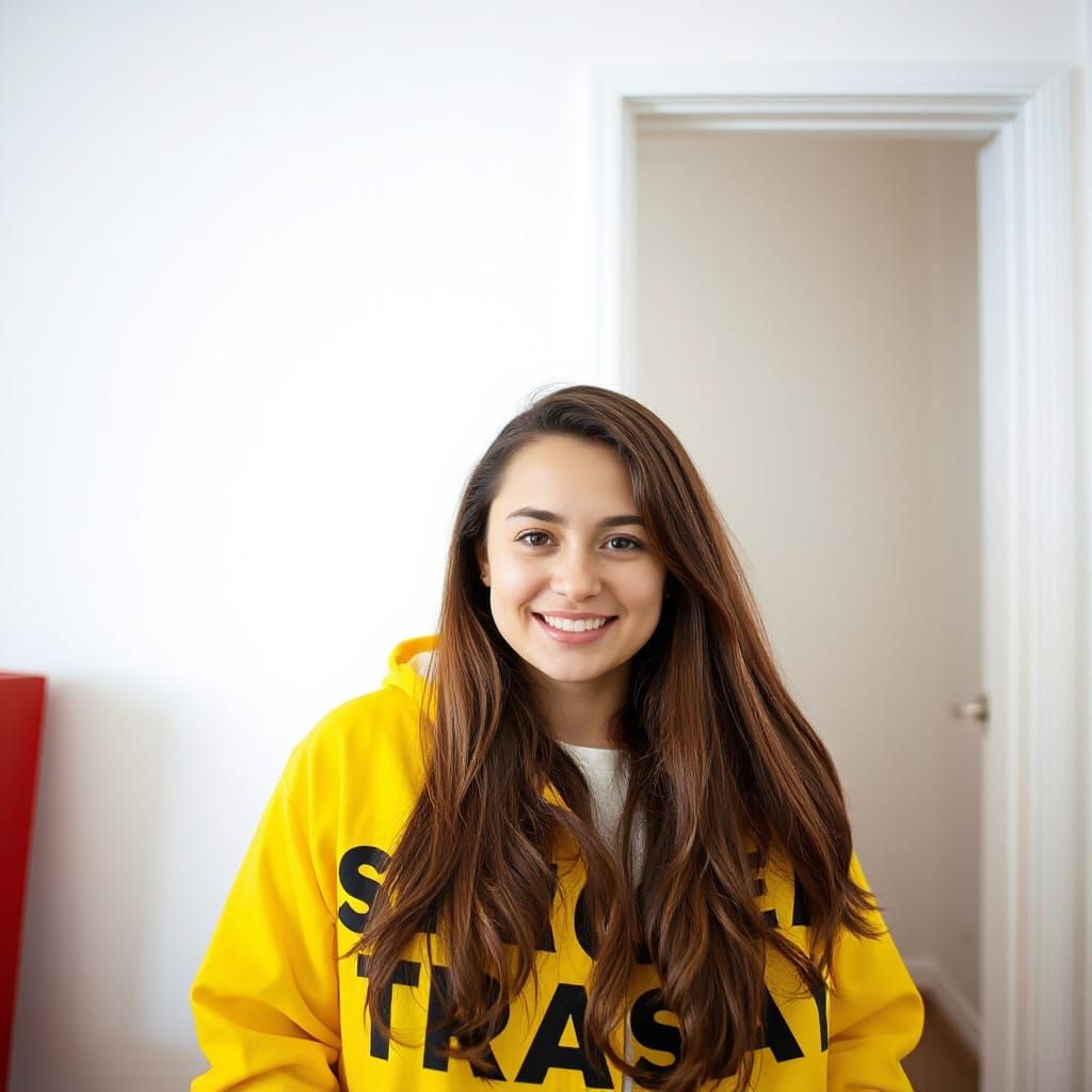 This image shows a smiling young woman with long brown hair. She is wearing a yellow jacket with black text, posing against a plain white wall with a red object nearby. The composition is simple and uncluttered.