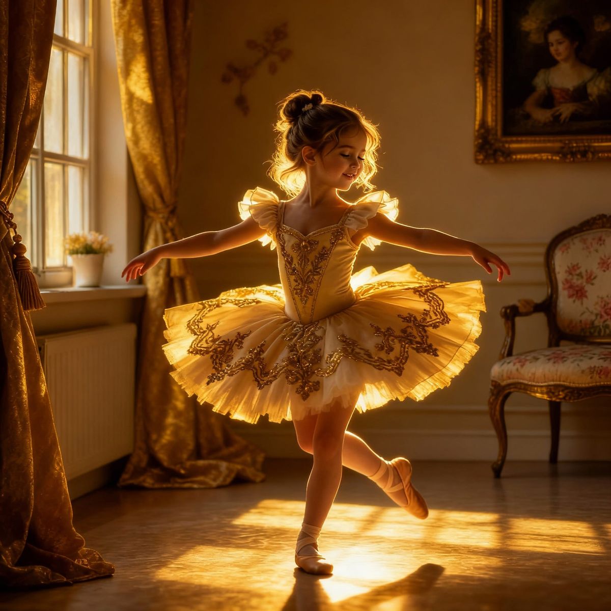 This image features a photorealistic portrait of a young girl gracefully dancing in an ornate ballet dress, bathed in soft, golden cinematic light.