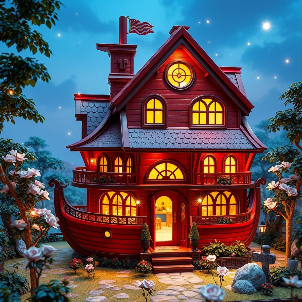 This image depicts a modern village house with a futuristic twist, featuring a red wooden interior, golden lighting effects, and a stunning garden with jasmine trees and roses.