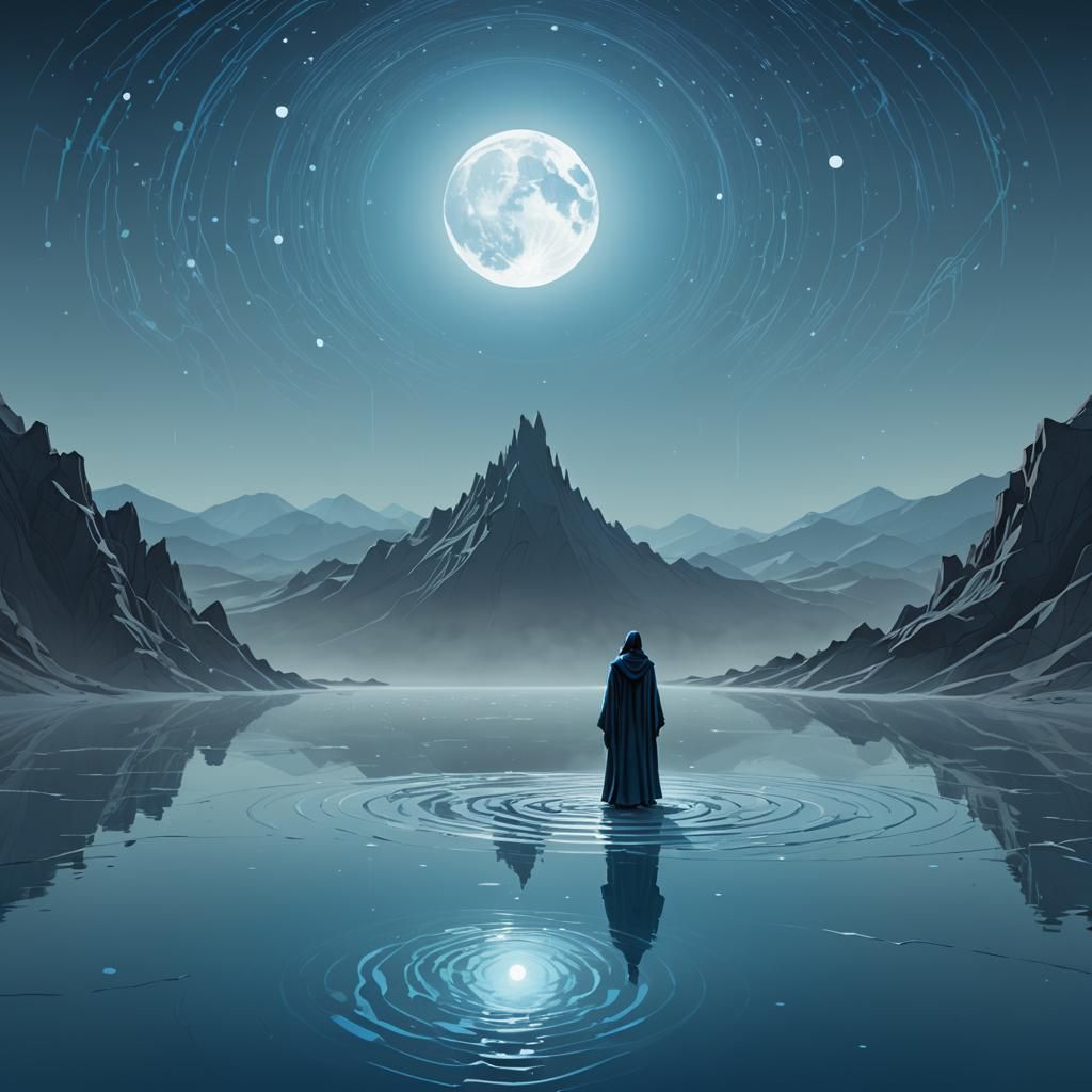 This image shows a figure in a blue cloak standing in an ethereal pool, facing rising full moons. Rendered in a low polygon, vector art style, the piece evokes sci-fi mysticism with a dreamlike, monochromatic palette.