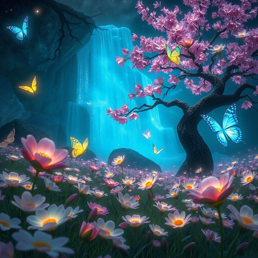 A vibrant image of a bioluminescent flower field with butterflies. A cherry blossom tree hosts colorful birds, with a radiant waterfall and glittering crystals in this dreamy, ethereal scene.