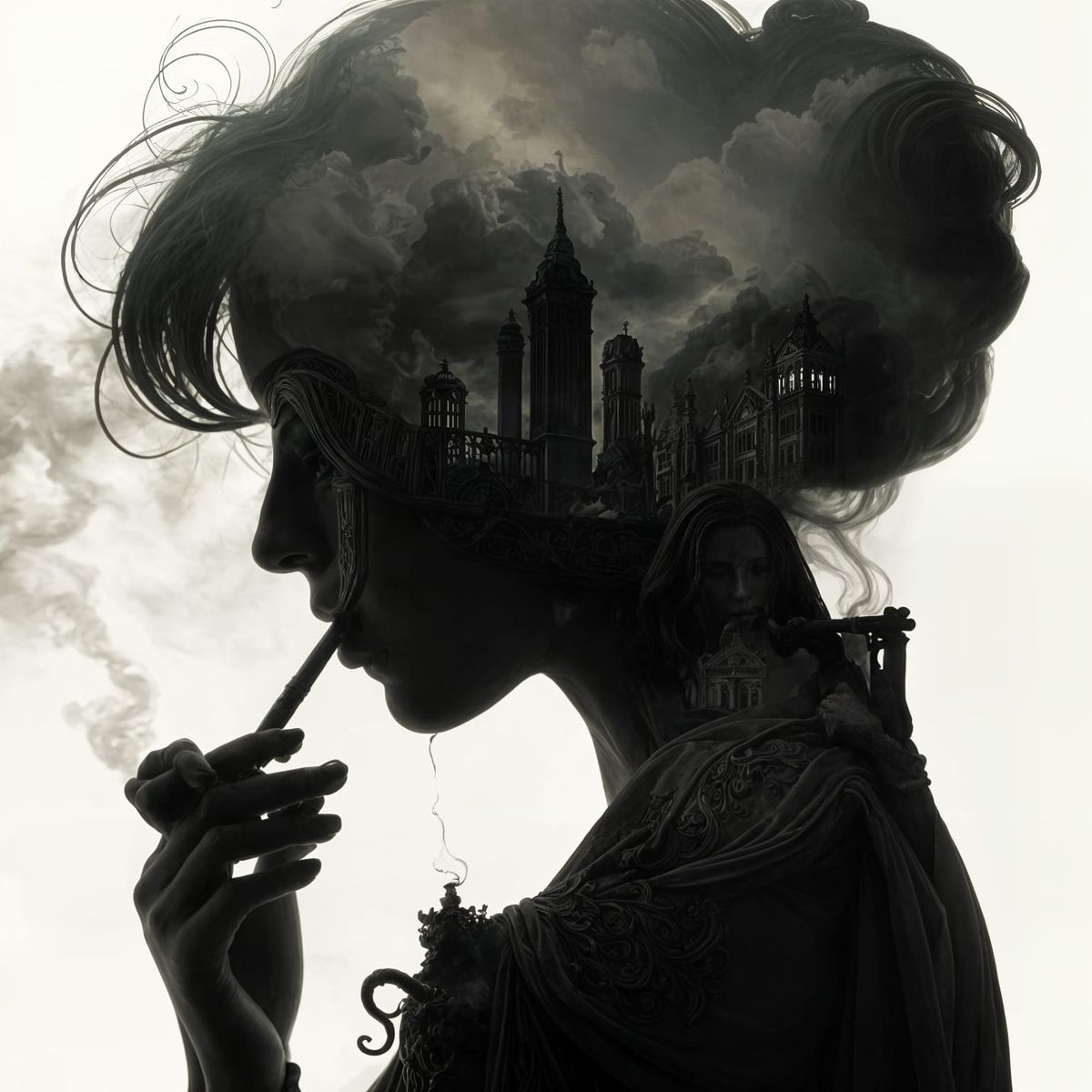 A moody, atmospheric image of a woman smoking a pipe, with a double exposure fantasy cityscape visible within the smoke, reminiscent of fin de siecle art