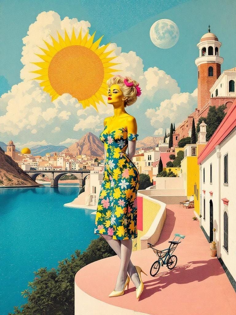 A surreal collage of a woman standing in a landscape. The mixed media artwork features geometric patterns, dimensional perspective, and dreamlike combinations in a surreal aesthetic.