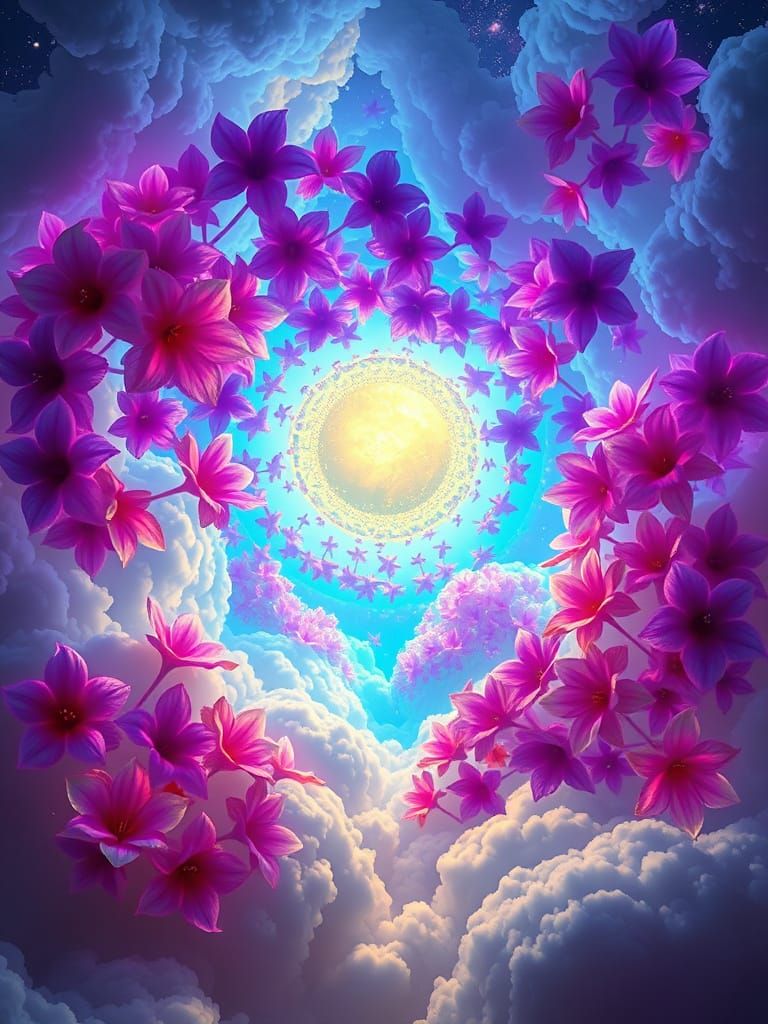 A mesmerizing image of bioluminescent flowers arranged in Fibonacci spirals, emitting sapphire light. The scene features exotic blooms floating among silvery clouds with a gleaming, golden sun, rendered in a hyperrealistic style.