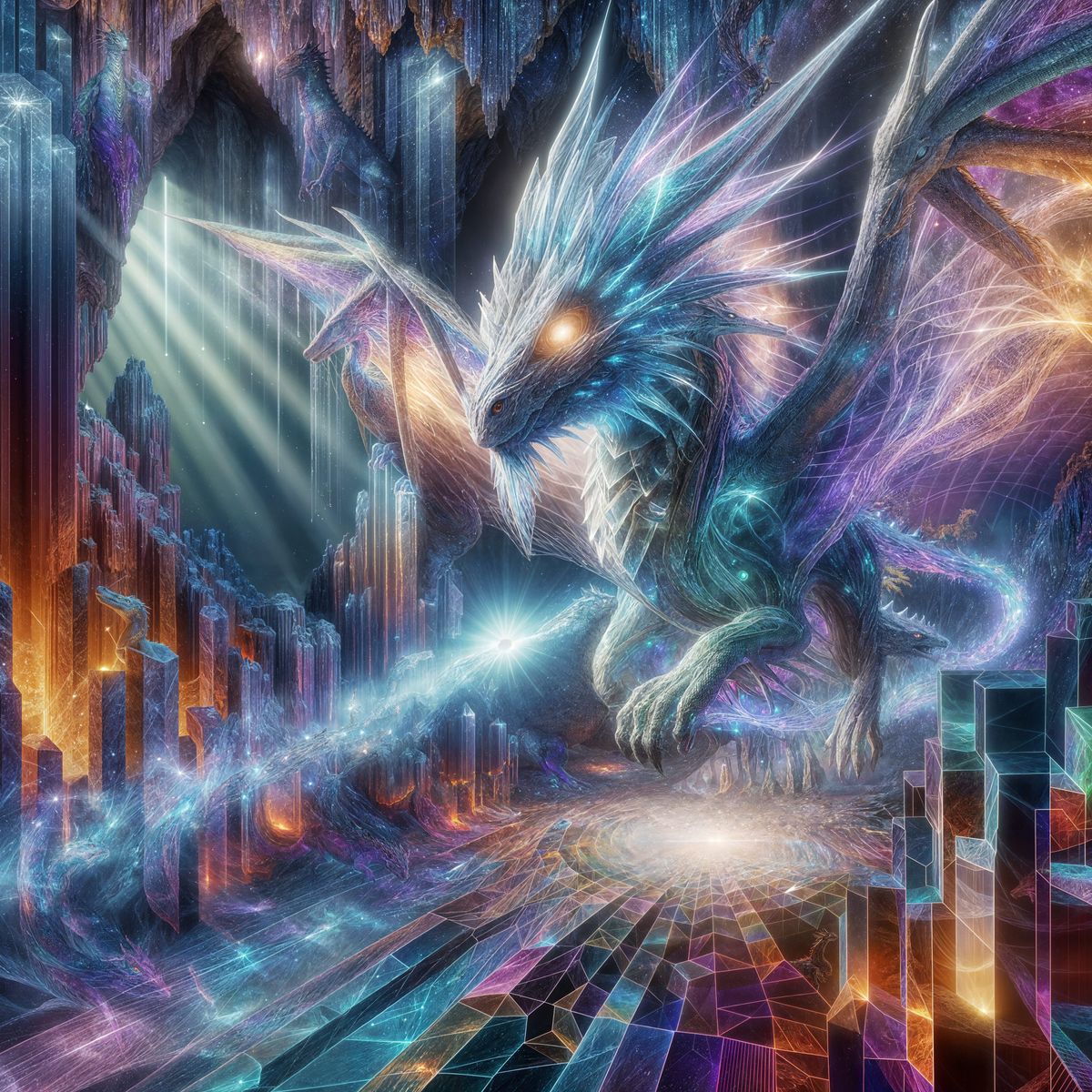 This digital artwork depicts a holographic dragon emerging from a crystalline cave, its scales reflecting a kaleidoscope of colors. The dragon's eyes shine with an otherworldly light, and its breath leaves trails of glittering dust. Portrayed in a futuristic, surreal style reminiscent of early 19th-centu...