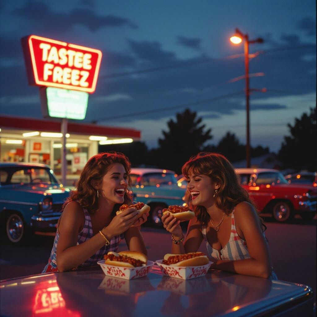 This image shows a retro scene of teenagers in a small town. Vintage cars sit under buzzing streetlights as friends share chili dogs in the warm glow of a summer night, in a cinematic, Polaroid style.