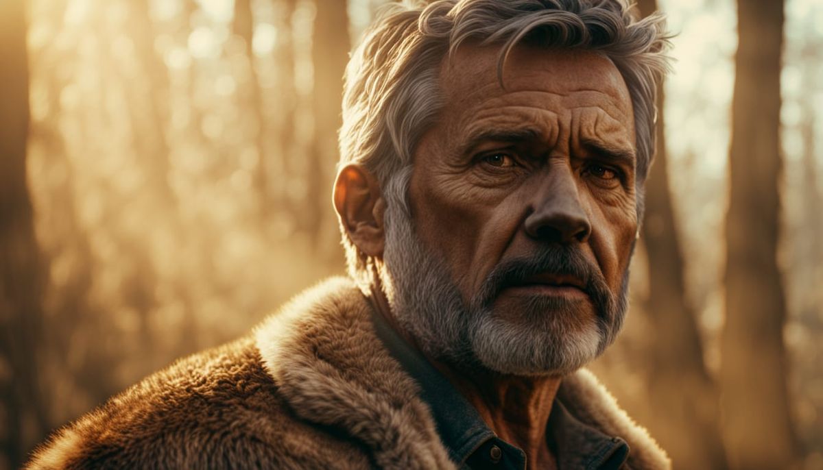 This image shows a hyper-realistic close-up of a mature man-bear hybrid standing in a misty environment. The warm, golden light and soft bokeh create a moody, cinematic atmosphere.