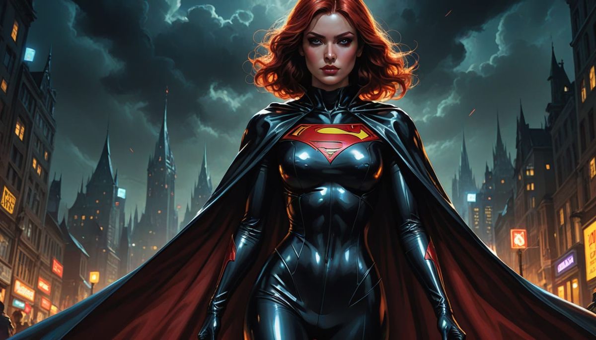 A close-up of a woman in a glossy latex suit, cape flowing behind her, set against a richly colored background with moody lighting, reminiscent of comic book art.