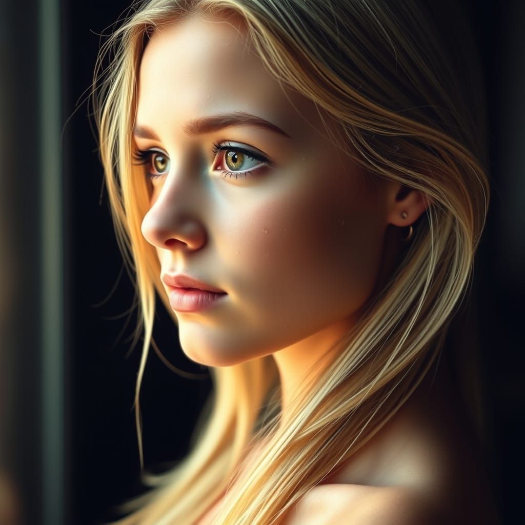 A striking picture of a young German woman with long blonde hair, illuminated by a warm light. The high-resolution portrait features water droplets enhancing her brown eyes.