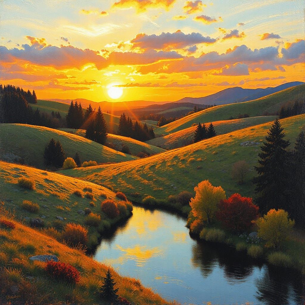 A serene landscape painting featuring rolling hills and a tranquil lake at sunset. The artwork captures the warm golden light with thick textures and vivid colors in an impressionistic style.