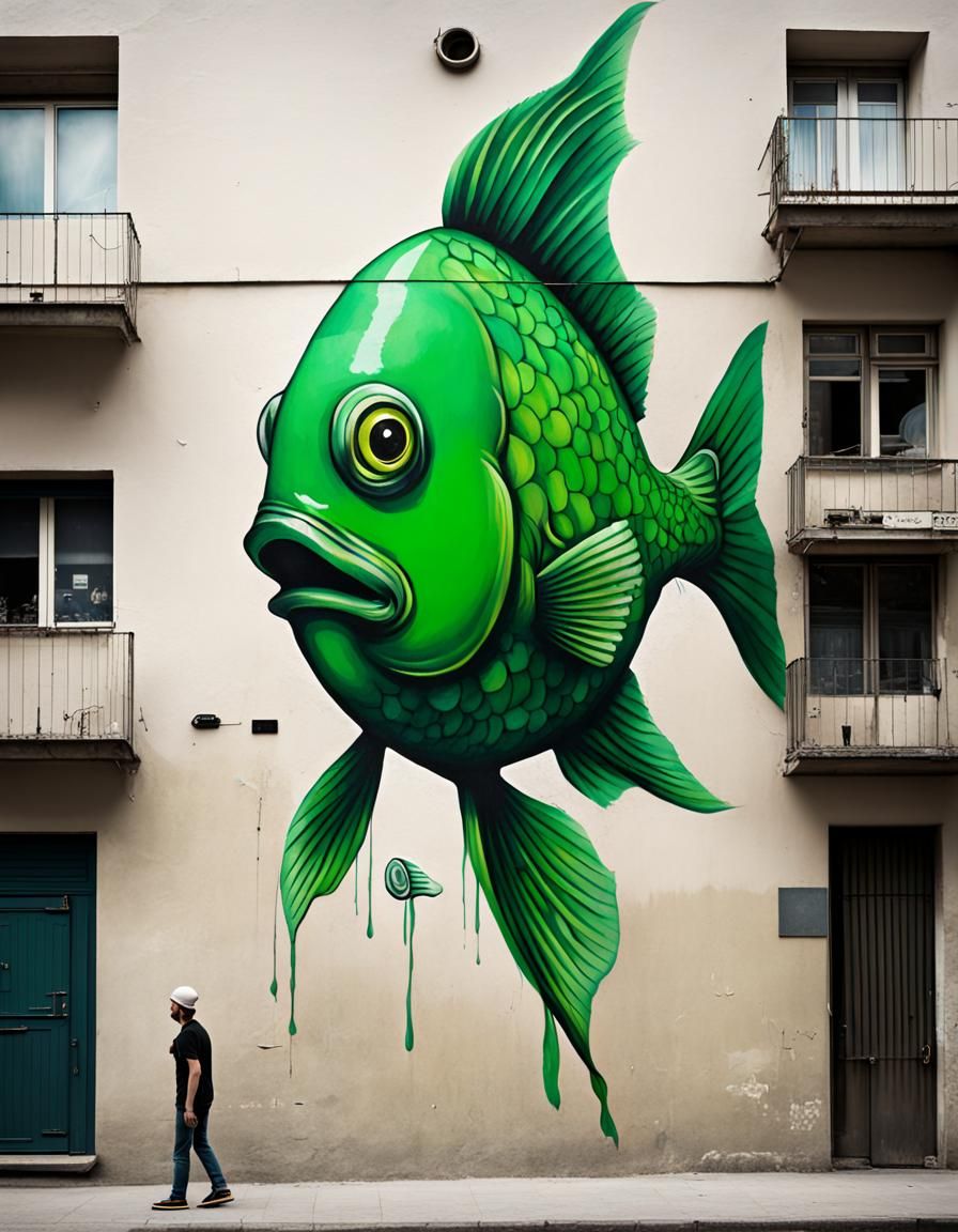 This image shows a vibrant green fish depicted as graffiti art on a building's side. The high-resolution painting is in a street art style, creating an urban aesthetic.