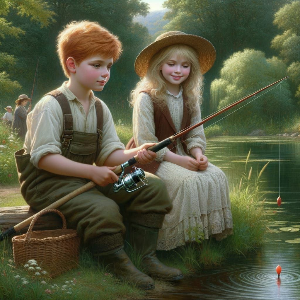 This image shows two children fishing by a pond on a sunny day. Lush greenery surrounds the tranquil scene, depicted in an oil painting style reminiscent of 19th-century pastoral art.