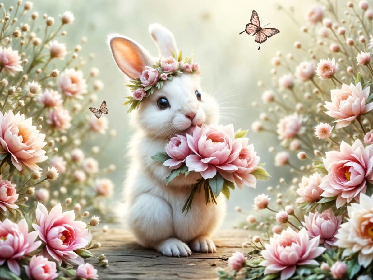 A charming image of a fluffy white bunny holding a large bouquet of pink, white, and magenta peonies. A cottage garden with a fountain and butterflies is in the background.