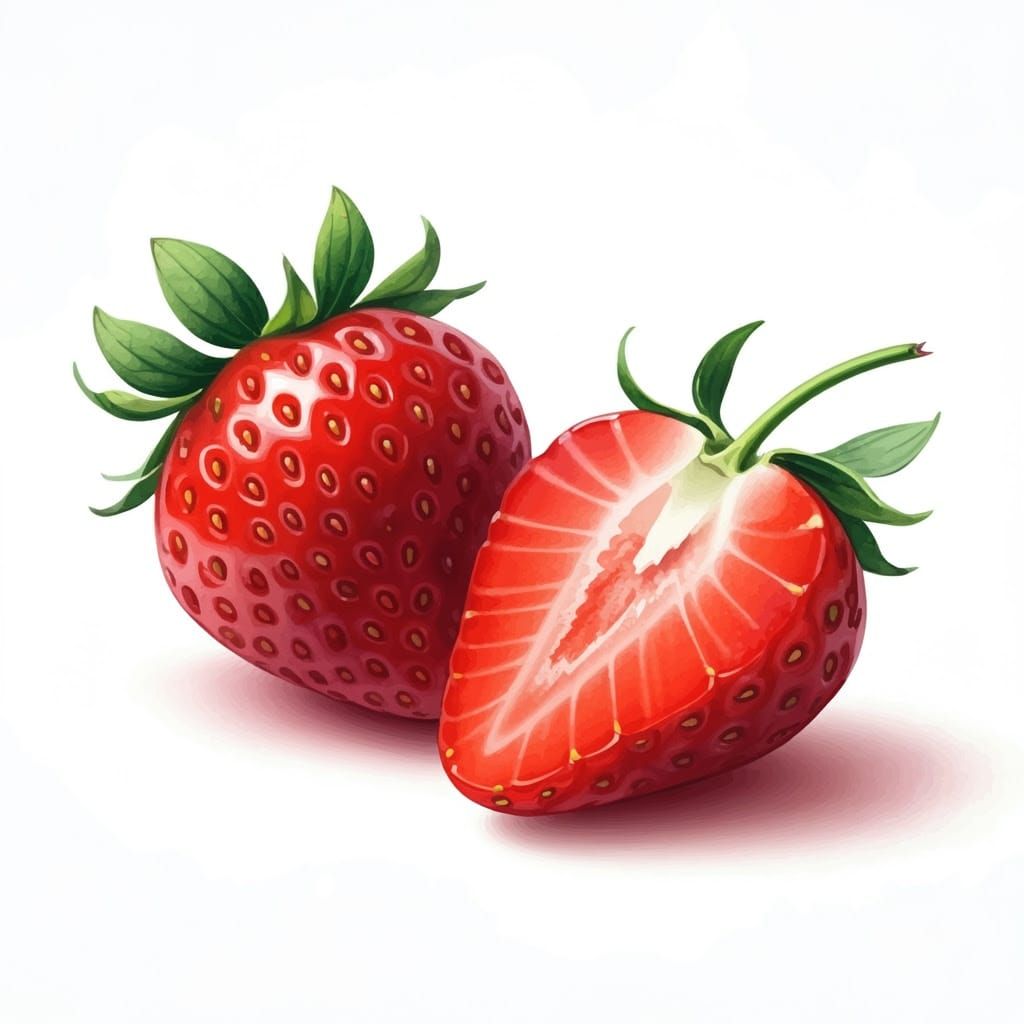 This image showcases two ripe strawberries, one whole and one sliced, set against a crisp white background. The delicate brushstrokes and translucent washes evoke the ethereal quality of watercolor art, with soft pinks and reds blending into a sense of depth and luminosity.