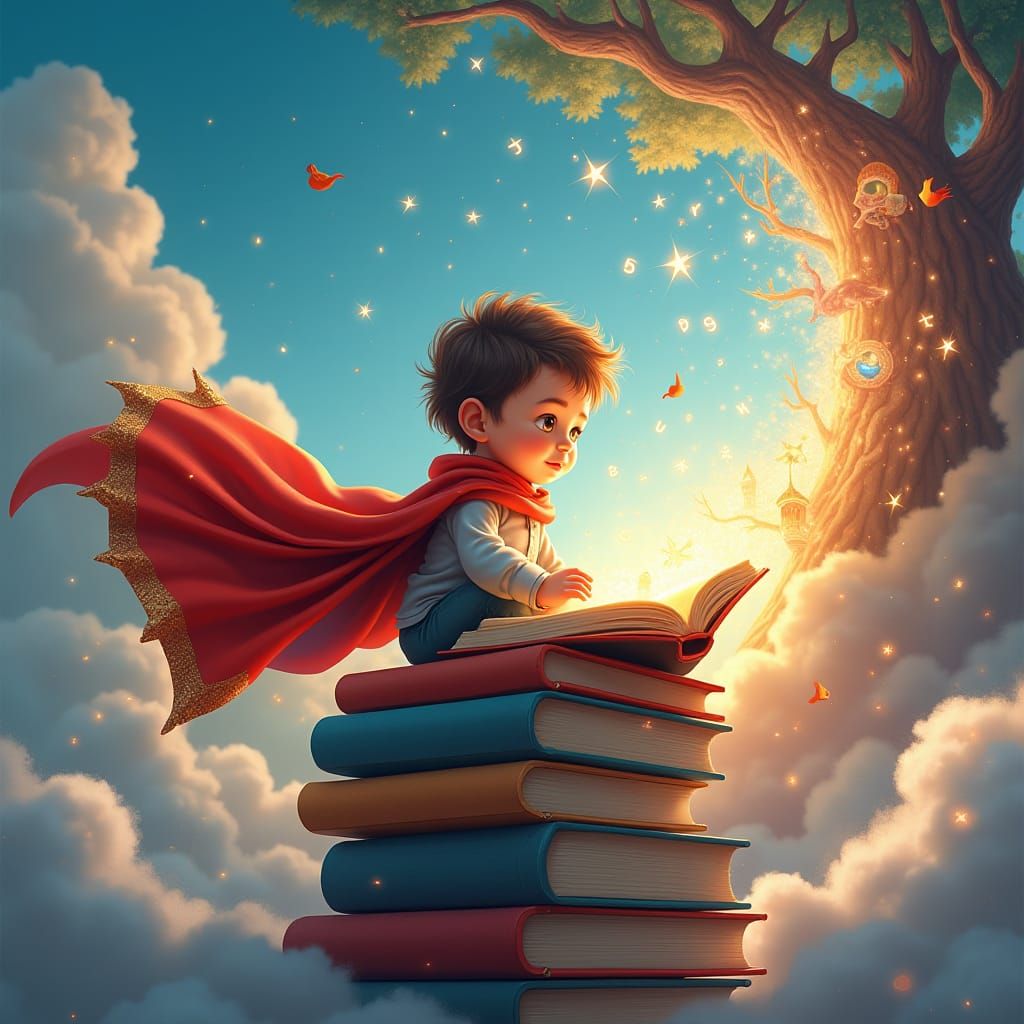 This image shows a child sitting on a stack of books, wearing a superhero cape. The child is reading a book that is coming to life with swirling text and images, in a fantasy concept art style.