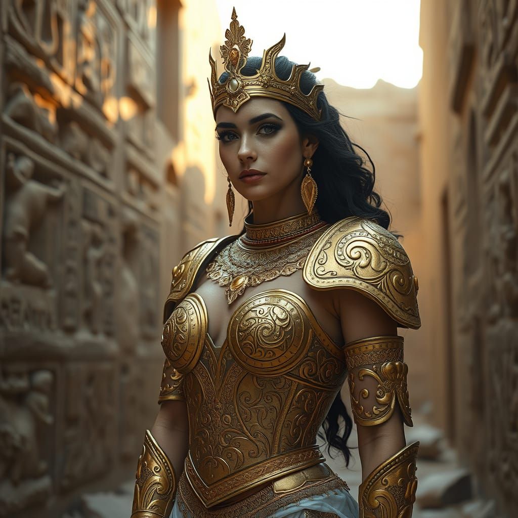 This image depicts a majestic woman in ornate golden armor standing amidst ancient ruins, bathed in warm, soft light. The intricate carvings and hieroglyphics on the walls blend with the golden filigree on her body, creating a hyperrealistic scene reminiscent of a museum-quality exhibit.