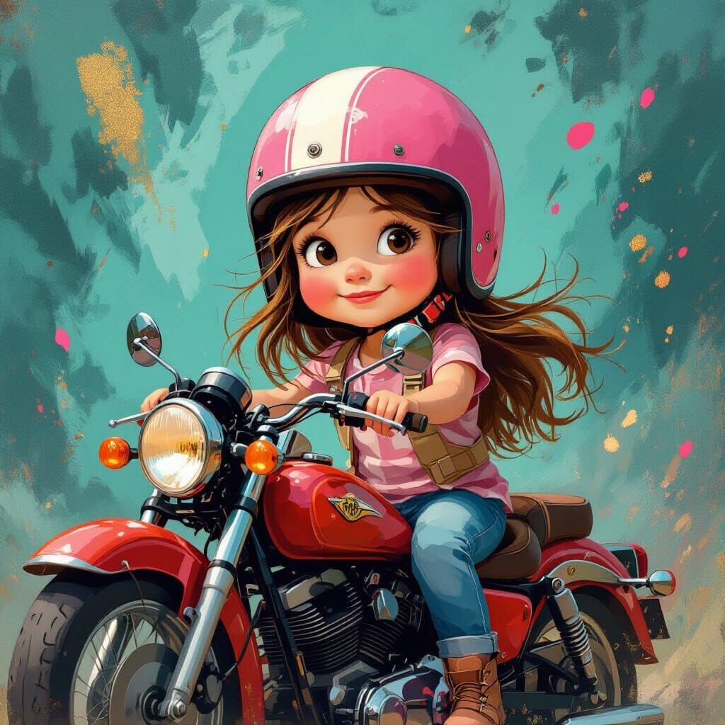 This image shows a happy young girl with long hair wearing a pink helmet, sitting on a rusty vintage motorcycle. A vibrant, abstract paint splash background creates an energetic, celebratory mood in a whimsical illustration style.