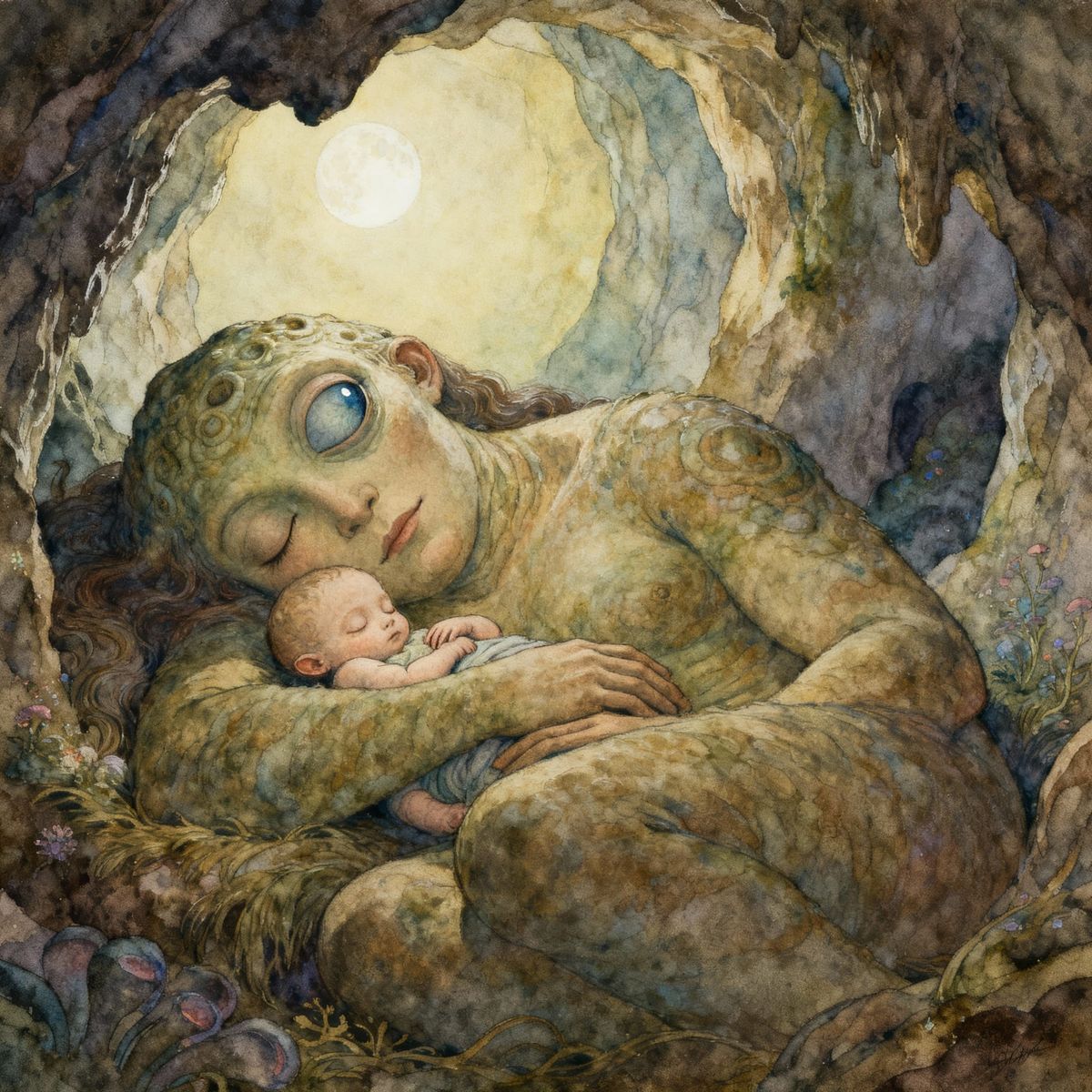 This image shows a giant cyclops mother sleeping peacefully with her baby, showcasing maternal love in a softly lit cavern. Rendered in a painterly storybook fantasy style with muted earth tones and a dreamy atmosphere.