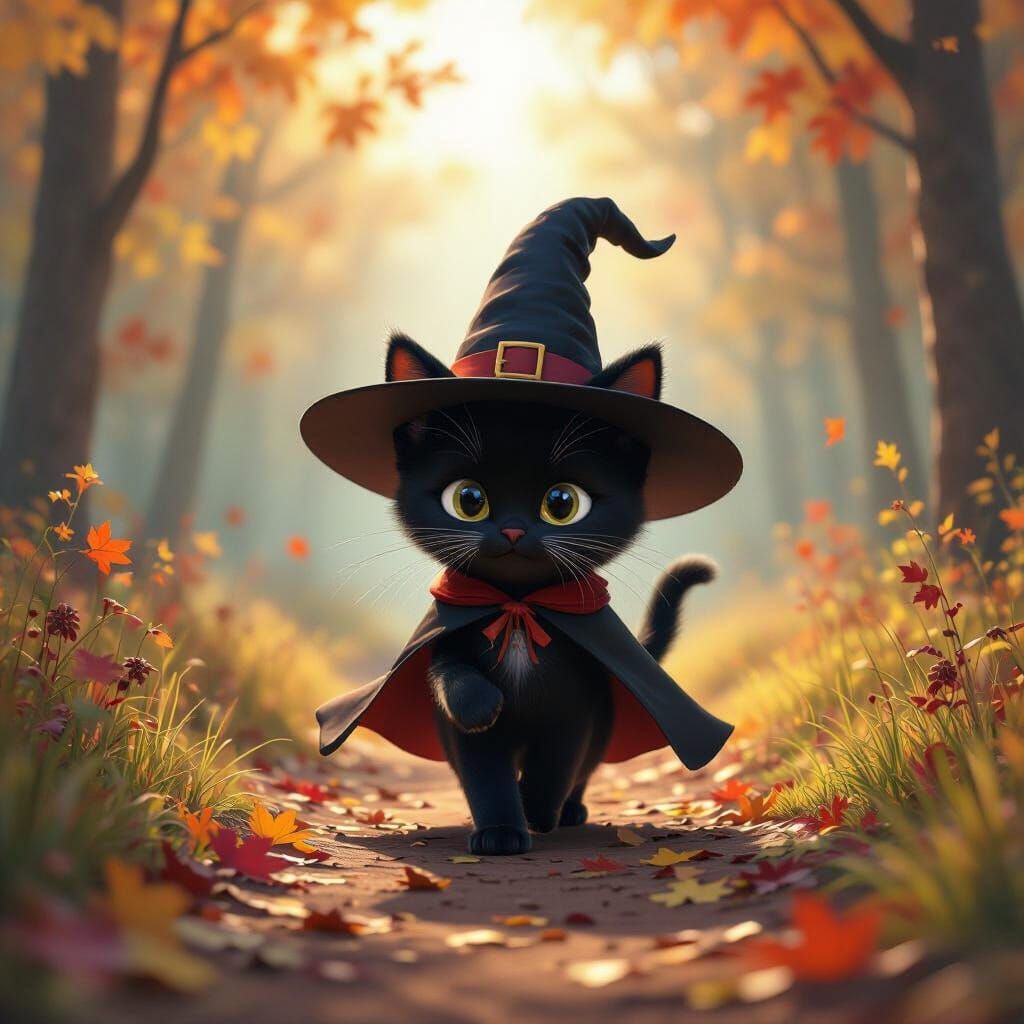 A charming black kitten dressed as a witch strolls through a vibrant, fall-colored forest path. Warm sunbeams create a magical atmosphere in this detailed 3D digital art.