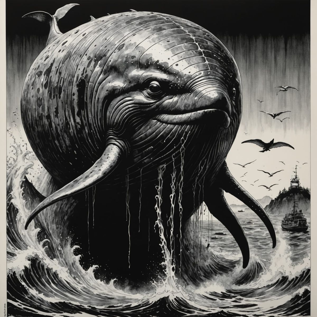 This image features a terrifying whale rendered in a detailed ink drawing style, reminiscent of classic horror manga. The artwork captures a sense of dread and unease.