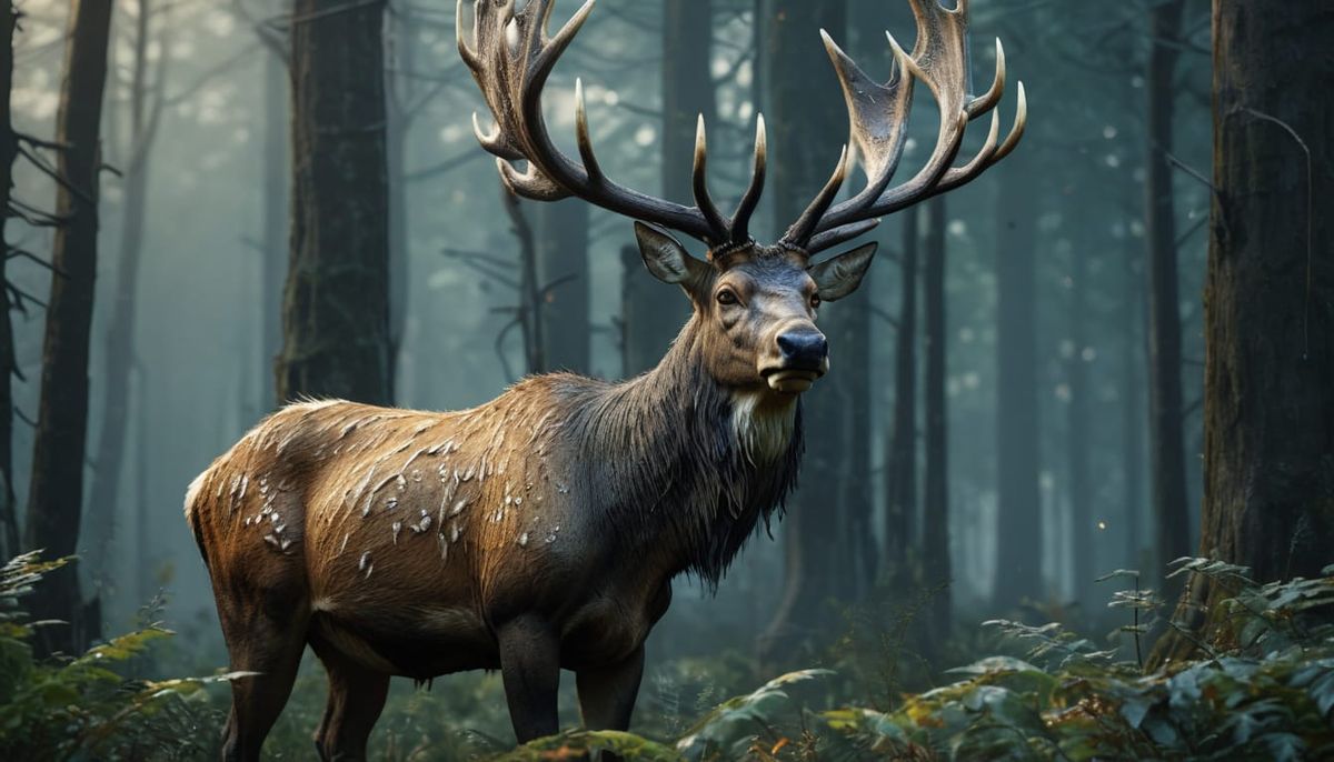This image shows a Megaloceros, also known as an Irish Elk, standing in a misty forest environment. The artwork is rendered as an oil painting with soft lighting and a warm color palette.