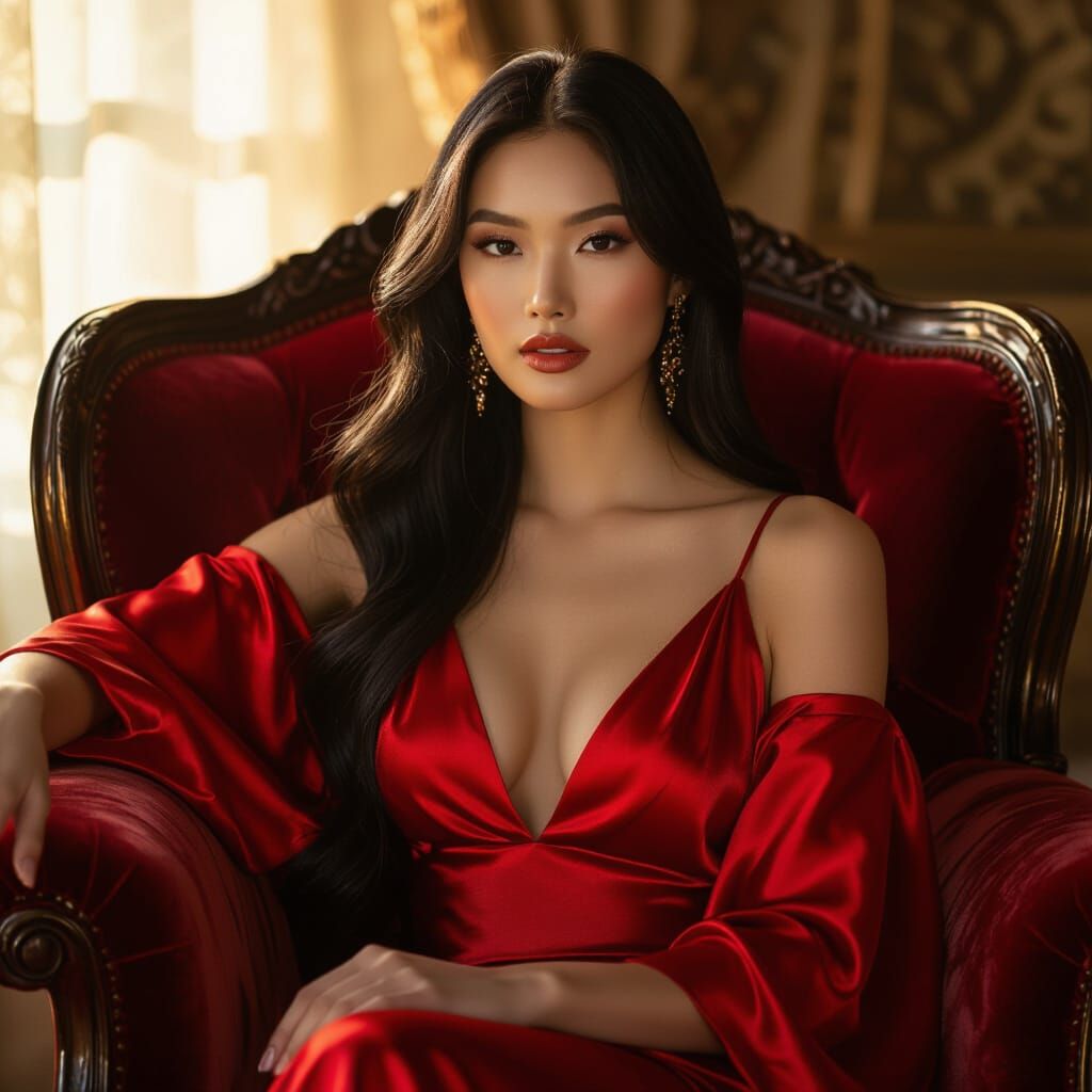 This image shows an elegant Southeast Asian woman posing in a red silk dress. The golden hour lighting and cinematic photography create a luxurious, ultra-realistic aesthetic.