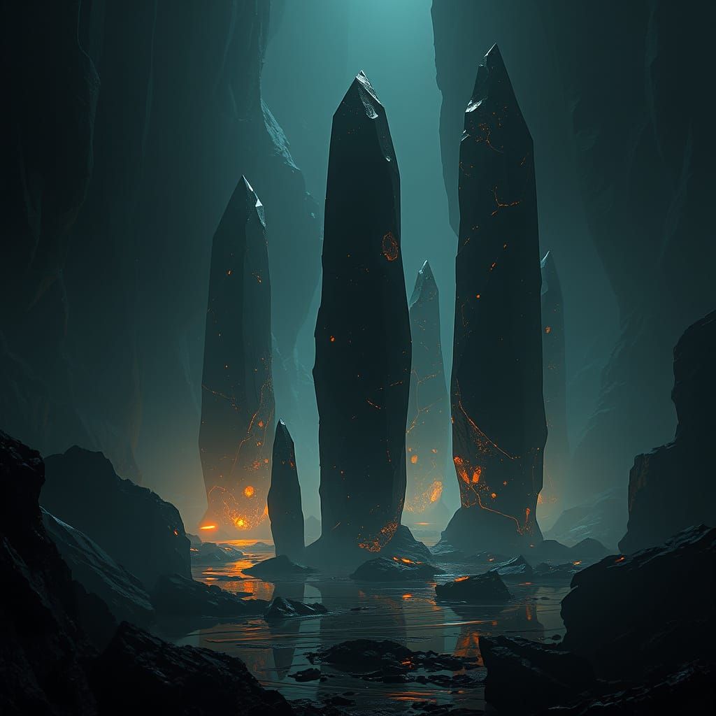 A striking picture of black onyx crystals shimmering in the darkness. The image evokes a futuristic aesthetic with dystopian elements and atmospheric lighting.