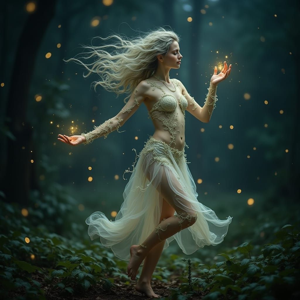 This image shows a captivating forest sylph dancing at night. The figure, bathed in moonlight and adorned with vines, is surrounded by glowing fireflies in this ethereal scene.