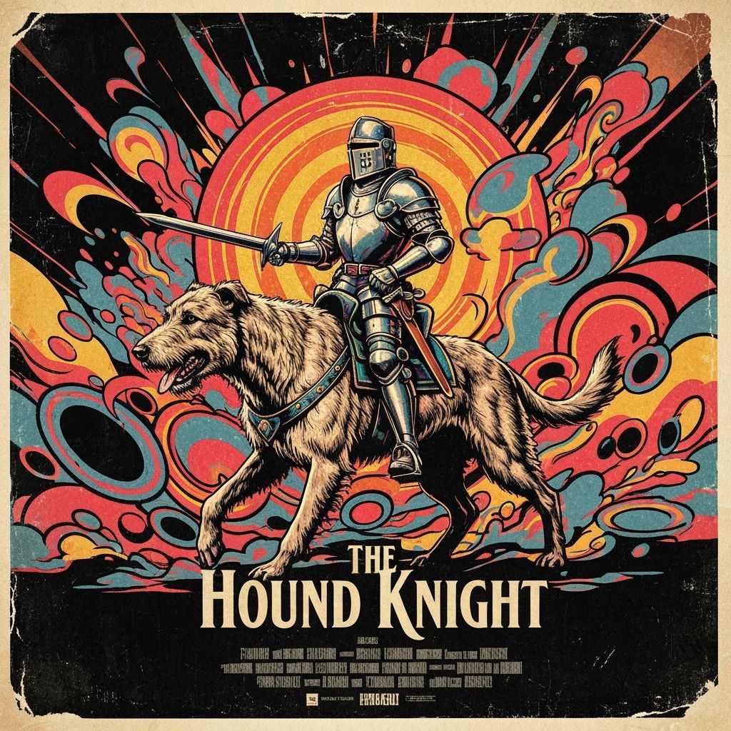 This image shows a knight on a wolfhound charging into battle. The vintage movie poster style art incorporates bold colors and swirling patterns to create a dynamic fantasy scene.
