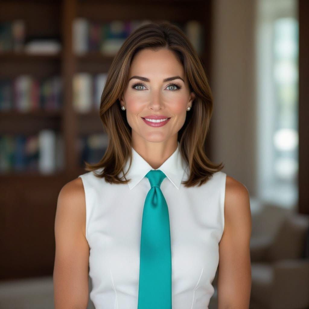 This image shows a stylish, photorealistic portrait of a poised, athletic 50-year-old woman in an office setting. The image captures hyperrealistic techniques with meticulous detail.