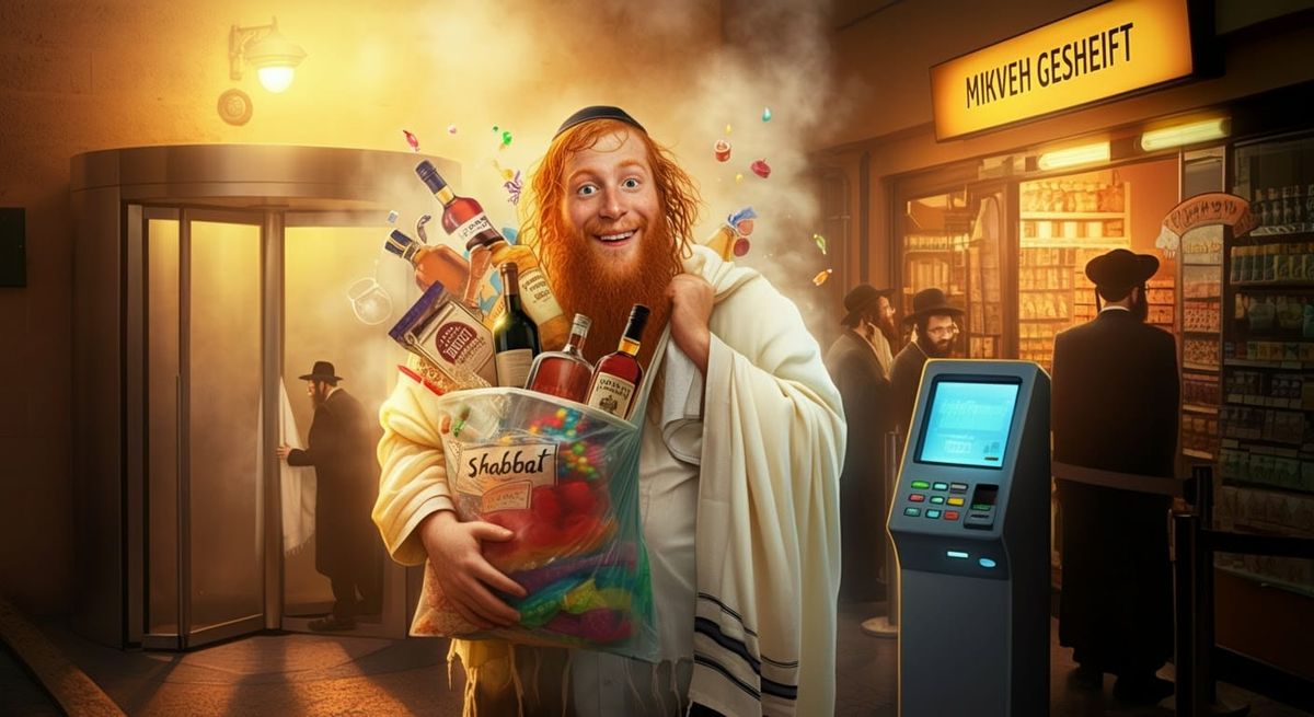 A vibrant, photorealistic comic-style image of a smiling Hasidic man outside a mikveh. He carries Shabbat goods in a shopping bag, with steam and activity filling the background.