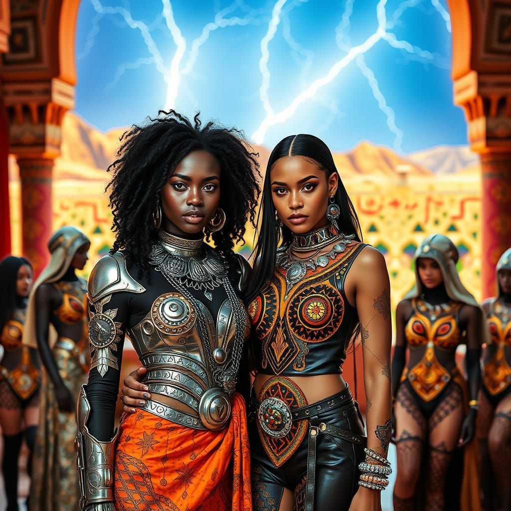 A photorealistic image of two women in futuristic outfits posing in a Moroccan riad with models and a lightning field background. The scene blends graffiti, street art, and textures in high contrast with polychromatic hues.