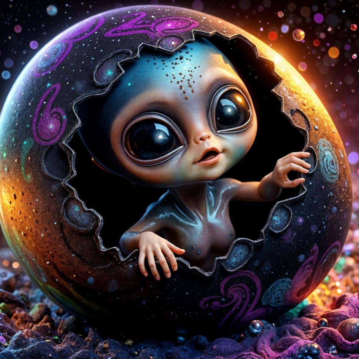 This image shows a sweet, smiling alien in its first moments after hatching, its innocence and curiosity on full display.