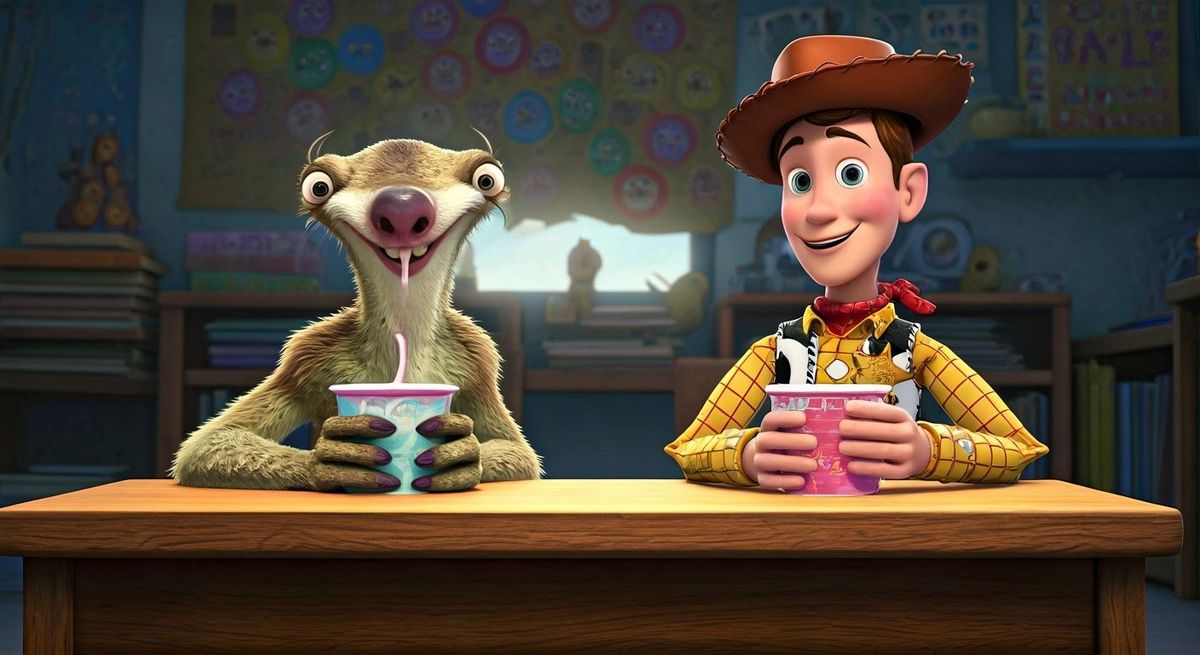 This image depicts Sid from Ice Age and Sheriff Woody enjoying yogurt in a classroom, rendered in a Pixar-inspired style. The scene features vibrant textures and warm lighting.